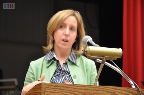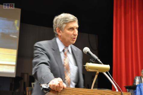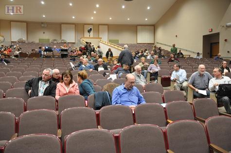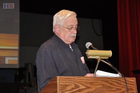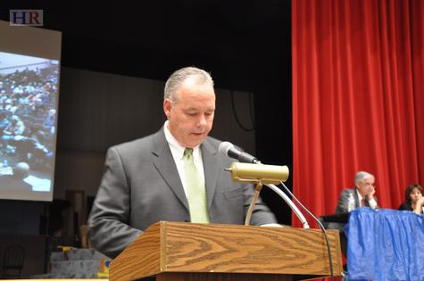Finance Committee chair Ken Szajda, above, reviewed the process and the salient points of tonight's town meeting.