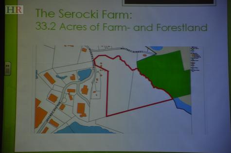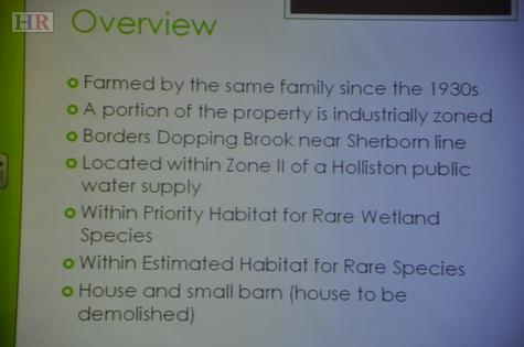Tony Lulek, noting that the town has been moving ahead with agricultural pursuits, especially by becoming a Right-to-Farm Town, enthusiastically recommends the purchase of this property. "This property gives us a a great opportunity," he said. The agricultural committee is looking forward to creating a multi-use farm with an educational component. "People need to know what farming is about. This is an absolutely beautiful piece of land. We will do something important for the town of Holliston," Tony Lulek urged the approval of this purchased "Asphalt is the last crop," his last slide read.