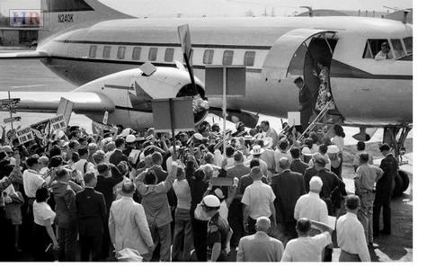 It was JFK’s father who bought the plane for the tidy sum of $270,000. The twin engine craft was powered by Pratt and Whitney R-2800 engines and refitted to meet the rigors of the campaign with a full food galley, bathrooms, a bedroom and a work desk with a large map of the United States. Sixteen seats ran along the right side of the plane. The plane gave JFK and his staff the advantage of speedy, comfortable travel to win votes in all 50 states. JFK would often invite reporters to join him in his campaign swings to key states.