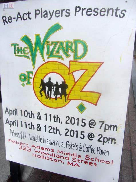 The Re-Act Players, Holliston's middle school drama club, will perform the classic musical, The Wizard of Oz, in four performances beginning Friday, April 10 at 7 pm, Saturday, April 11 at 2 pm and 7 pm, and Sunday April 12, at 2 pm. All performances will be held at Holliston's Robert Adams Middle School located at 323 Woodland Street. Tickets are $12, and will be available for sale beginning March 14 at Fiske's General Store and Coffee Haven, both located in Holliston's downtown area. Tickets may also be available at the door.