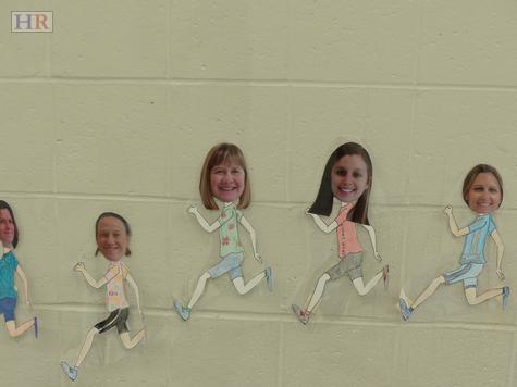 The students are not only trying to accumulate distances for themselves, but for their classroom. Each class in grades 3, 4, and 5 is competing against each other by tabulating how many miles they accumulate between now and May 29th. Each classroom’s miles are calculated into “miles/student” and displayed in the hallway outside of Miller’s cafeteria. Under each banner is a photo of their teacher’s head attached to a cartoon “running body”. The more miles each classroom accumulates, the higher their teacher’s running body rises on the wall. The classrooms who have accumulated the most “miles/student” will earn the “golden sneaker” award for their grade. This trophy will proudly remain in that classroom until the following year. These students will also earn “golden shoelaces” for their effort.