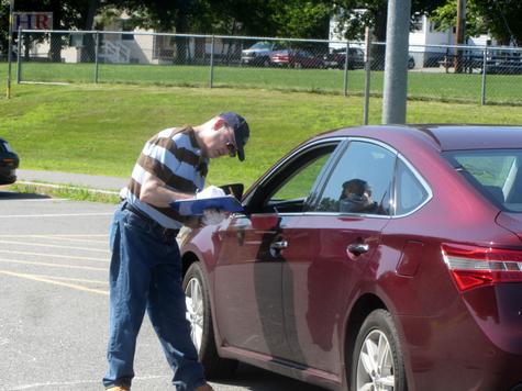 Vehicles were lined up in the Miller/ Placentino school parking lots winding their way to the drop off point in the Adams School parking lot. According to Tom Evans of School Street, he waited one hour and fifteen minutes in line.