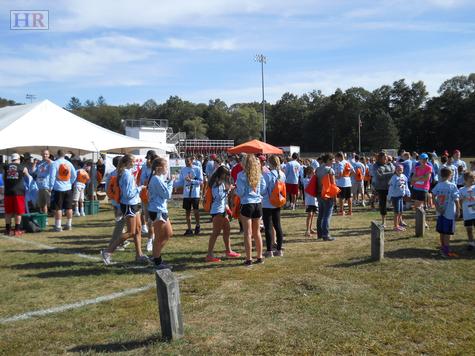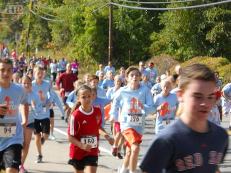 On September 26, The Timothy O'Connell Foundation hosted its fifth annual Tim's Trot, a 1.9 mile walk-run that each year draws growing numbers of runners and walkers of all ages, This year, according to volunteers manning the registration booths, more than 675 men, women and children participated. Donning the now familiar blue tee shirt emblazoned with an orange "7" and the names and logos of local merchants and families who sponsor the event, runners, walkers and more than a few parents pushing baby carriages or walking dogs set out under sunny skies from Holliston High School along a route snaking along Hollis, Washington, Prospect Streets and Marked Tree Road.
