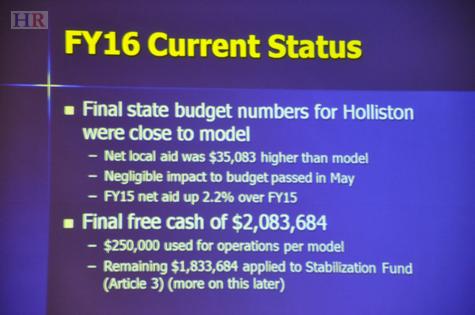 Szajda reported that local aid from the State had come in $35,085 higher than expected, but that this difference has no meaningful impact on next year's budget. He cautioned against relying on the significantly higher amount of $2,083,684 of "Free Cash" because it is volatile and there are big expenses coming up such as the demolition of the Andrews School and the Senior Center parking lot. He also noted that the snow and ice budget did not get approved at the May Town Meeting (last winter already a fleeting memory?!) and that Article I would make that appropriation.