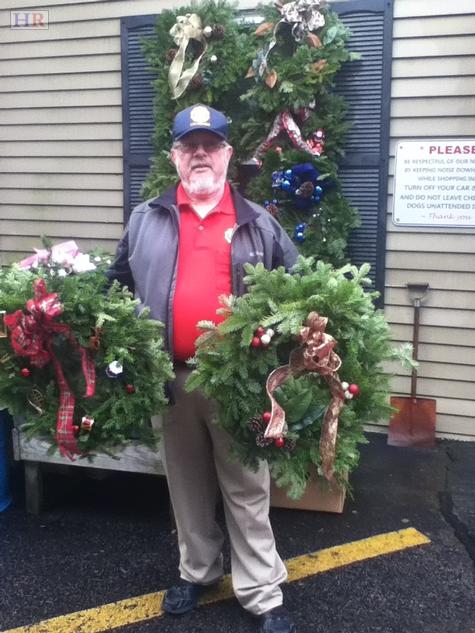 Food Pantry President Steve Bradford, above, accepting wreaths from past Garden Club President, Jill Malcolm, below.