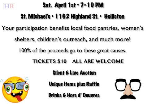 St. Michael’s Episcopal Church in Holliston invites you to its annual Outreach Auction: No Foolin’—We Need You to be held on Saturday, April 1st, from 7 to 10 pm at 1162 Highland Avenue in Holliston.