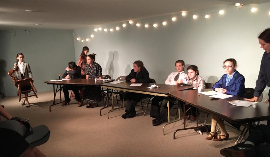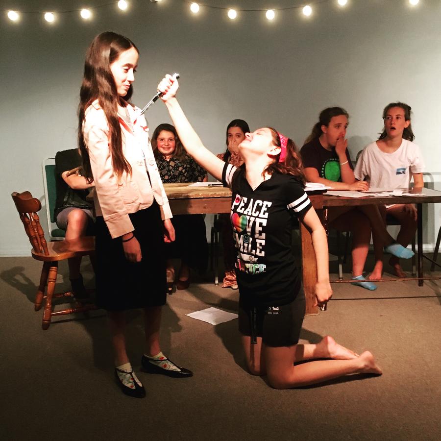 Rehearsing the confrontation with the switchblade in 12 Angry Men at the Prana Center. Paige Rezendes (with knife), Holliston 9th grader, with 7th grader Claudia McMahon. Note Peace Love Smile shirt! Looking on to the right with shocked faces are holliston 8th graders Zoe Rosen and Libby Stott.