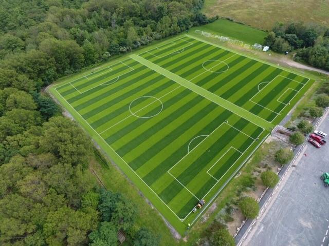 Below, aerial view of new turf fields