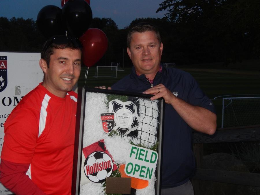 Chris Guccione was also recognized for his many years of volunteer service to Holliston Youth Soccer as a coach, coordinator and President. Pictured above: Tony Capela and Chris Guccione.