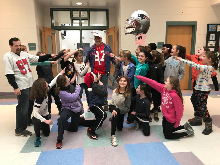 The Fifth Grade Leadership Team worked very hard to plan the drive and to motivate their peers to donate. Mr. Keim -- a big Steelers fan-- agreed to wear Patriots gear before the Pats vs. Steelers game if we collected 2,700 pounds of food and paper goods. We exceeded our goal by collecting a total of 2,875 pounds of food and paper goods in just week!