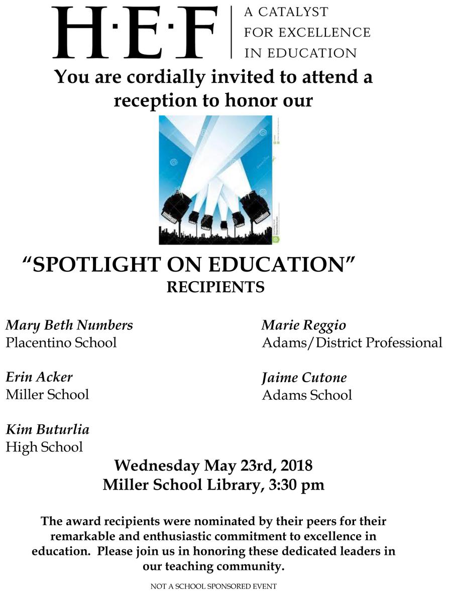 Please Join us to Celebrate the 2018 Spotlight on Education Award Winners on 5/23 – Presented and Sponsored by the Holliston Education Foundation