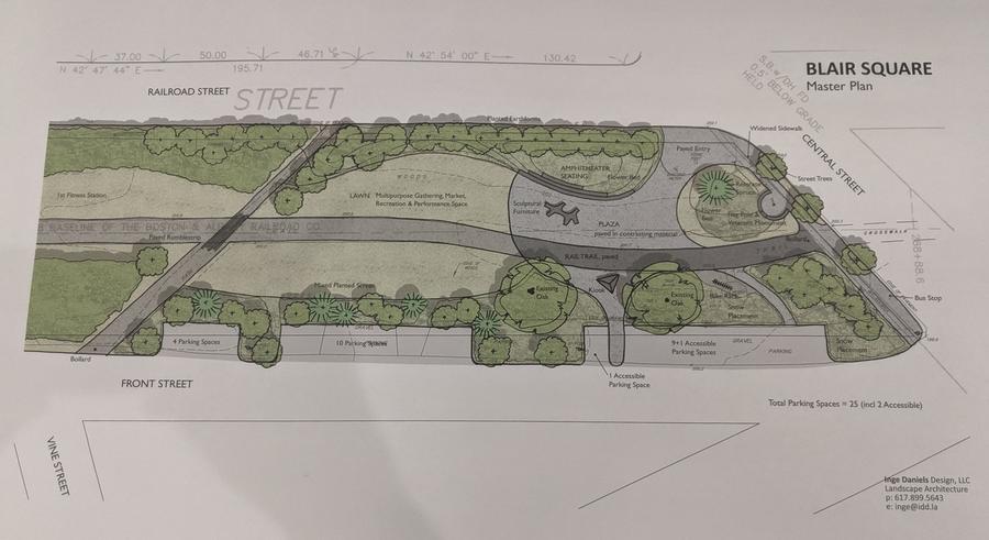 The plan would re-develop Blair Square into an open, town green-type space that could also be used for a variety of programs and events. Right now, the initial plan includes a large paved area, a small amphitheater area, and space to hold community events such as a small concert or farmers market. The park will be along the rail trail in between Railroad St. and Front St., stretching from Central St. down to Exchange St.