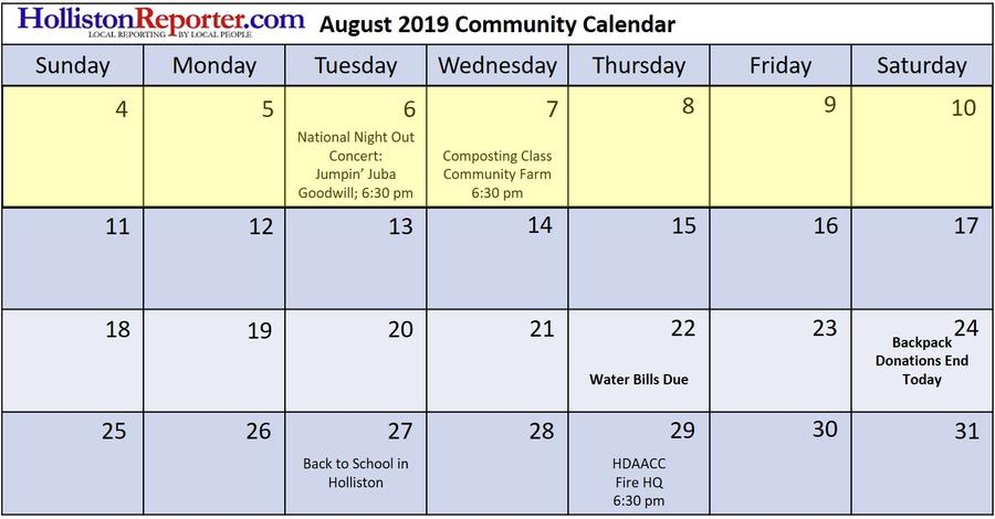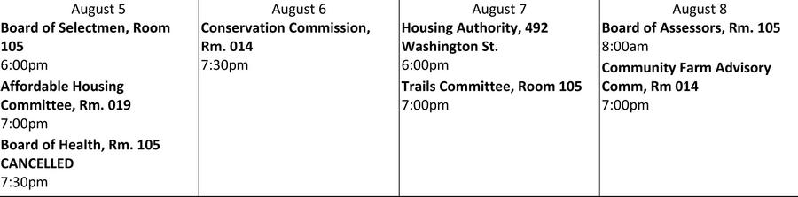 Weekly schedule of board / committee meetings as of 4 August 2019. Check the Town website for any updates.