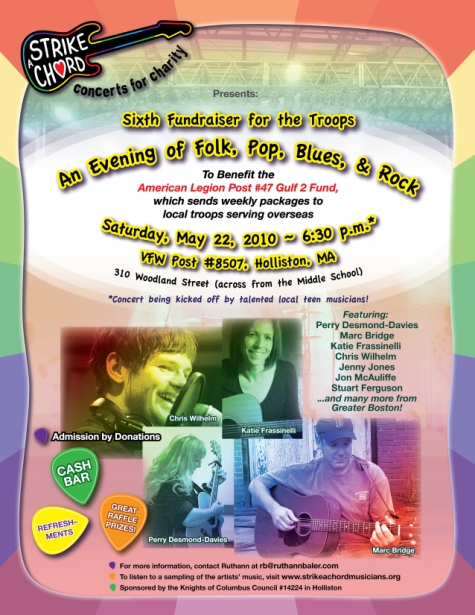 Area musicians will come together on Saturday, May 22, 6:30 p.m. at the Holliston VFW, 310 Woodland Street, to raise money for weekly care packages being sent to local troops serving overseas.
