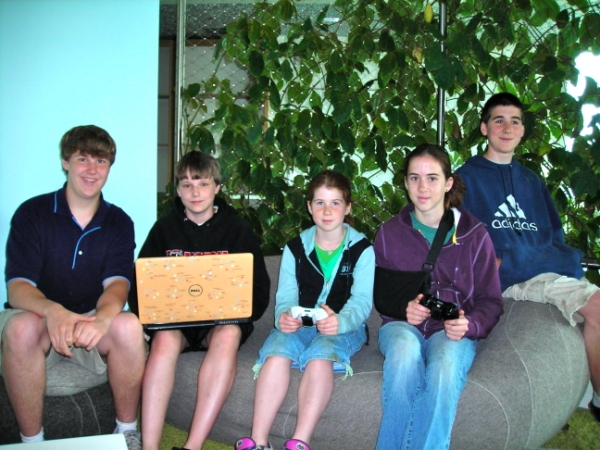 Pictured are Conor and Liam Doyle, Annie, Terry and John Aldrich in Microsoft's "forest" conference area. Terry, Annie and Mary Aldrich are working with local programmers.