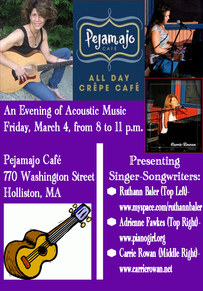 I will be playing at Pejamajo Café in Holliston on Friday, March 4, from 8 to 11 p.m. joined by two wonderful singer-songwriters. Carrie Rowan and Adrienne Fawkes.