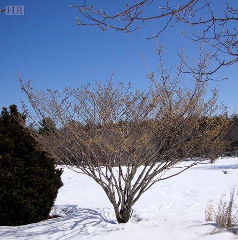 Vernal witch hazel (H. vernalis) and autumn witch hazel (H. virginiana) are native to North America. Vernal witch hazel, hardy to Zone 3, is a spreading, suckering shrub that reaches heights of around ten feet. It flowers the earliest of all the winter-flowering types. Bloom time is in January-February/March, a time when little else is going on in the garden. Its fragrant flowers have red-tinged yellow petals that curl up on very cold days to avoid freeze damage; in this way, blossoms can last 3-4 weeks. Flowers are small, but plentiful. Fall leaf color is an outstanding yellow that can often persist for 2-3 weeks.