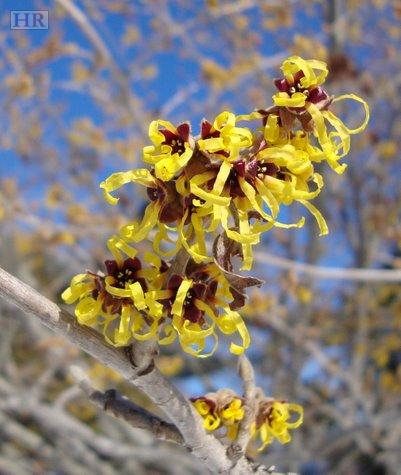 The Asian species of witch hazel (H. japonica from Japan and H. mollis from China) have been crossed by hybridizers to create spectacular cultivars, termed H. x intermedia. All bloom in late winter/early spring, after the vernal witch hazel. These vase-shaped shrubs are hardy to Zone 5, grow 15-20 feet high, and have a wide range of flower color and autumn leaf color. H.'Arnold Promise' is a cultivar introduced by the Arnold Arboretum. It has large, fragrant yellow flowers, each petal nearly an inch long, and a bloom time that is among the latest of all witch hazels. H. 'Diane' is considered the reddest of the red-flowering types. H.'Jelena' offers flowers with inch-long petals that are red at the base, orange in the middle and yellow at the tips. The overall effect from a distance is of glowing copper. Fall leaf color is rich orange-red. The number of H. x intermedia cultivars is staggering – your main problem will be in settling on which one to choose.