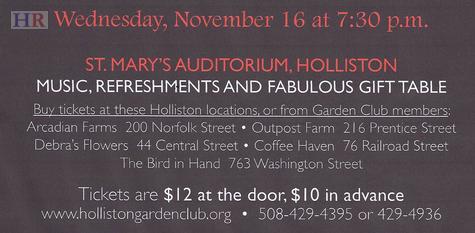 As this is our major fundraiser for the year, I'd like to share some of the things we do in our town that you would be supporting: education programs in the elementary school, yearly scholarships and grants, library decoration at the holiday, maintain the gardens at the library and various spots throughout Holliston, design and implement various garden sites throughout Holliston, Holliston Manor workshops, Christmas wreaths for the food pantry. As well we promote and educate the public about conversation, horticulture, and a variety of other garden and gardening related topics. One of the joys of our club is the openness to different types of projects. We are abounding with energy and ideas. We are a relatively small club with less than 50 members, but we live, work, and volunteer on a variety of projects in and around Holliston and throughout Massachuettes. You support of our open meeting goes a long way to support the Holliston Garden Club and all the work we have been doing for over 75 years.