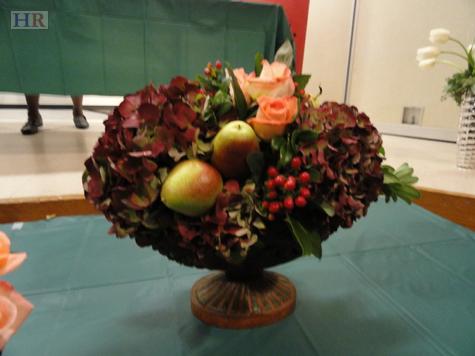 Mark’s first creation (above) was for an openwork compote which he first lined with a trashbag. To make a center piece suitable for a dinner table, he suggested putting your elbow on the table and pointing to the ceiling. The flowers should only reach to your wrist to allow for easy conversation. He then used hydrangeas, roses and pears for a lovely round piece that would look beautiful any time of year.
