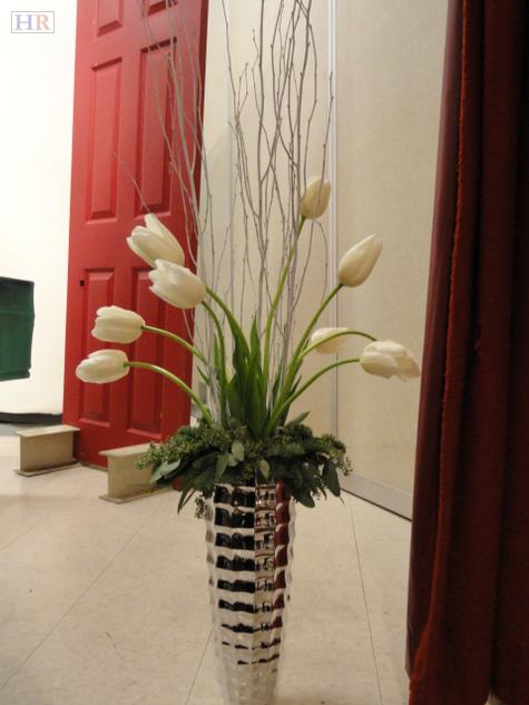 The fourth creation was made in a tall, silver metallic vase rimmed by a candle ring. White branches twice as high as the vase combined with white lilies and tulips making a striking arrangement. Again his expert eye really showed.