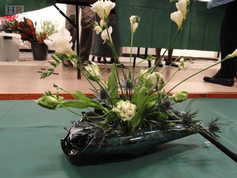 The last container was a low, modern, rolled dish which looked like a challenge. He used a frog which is a florist tool that I remember my mother owning – a heavy piece of metal with thin spikes to hold the stems. Mark used thistle, parrot tulips and freesia, scattering acrylic ice to cover the bottom of the dish.