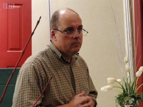 The featured speaker for the evening was Mark Hagopian, floral designer from Stonegate Gardens in Lincoln. Mark is an expert in the field of designing for the home, which immediately drew in every person in attendance. He had previously asked Holliston member Julie Pipe to provide him with a varied collection of containers so he could plan his purchases for the pieces he would create on stage. As he worked, he gave tips and fielded questions, the first being where he bought his materials. Florists and supermarkets were his choice. A person has to have a license to shop at the flower market.