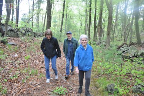 (Searching the paths on Miller Hill. The author with her husband, Rudy Nelson, and Joanne Hulbert, Holliston Town Historian.)