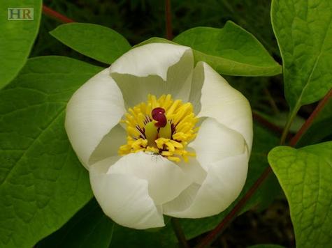 1. Japanese Peony (Paeonia japonica). A peony that prefers shade! Most peonies are sun-lovers, but not this charming woodland peony. It makes an 18" x 18" clump of grey-green foliage that is topped in early spring with lovely 3" wide white cups with yellow stamens. After flowering, pods form that split open to revealincredible, gorgeous metallic-blue seeds on red stalks. The Japanese peony is recommended as a deer-resistant specimen in the woodland garden and in the shady perennial border.