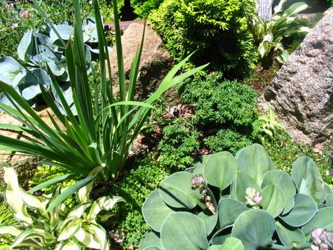 Miniature hostas are widely used in troughs, pots and rock gardens. When planted in garden settings, they look best grouped together and accented with other tiny perennials and conifers. In my garden, I have grouped three minis (H.’ Little White Lines’, H. ‘Shiny Penny’, and H.’ Baby Bunting’) with a dwarf variegated grass (Carex caryophyllea ‘Beatlemania’), the elegant Epimedium ‘Lilliputian’ and the dwarf Astilbe ‘Cobblewood Shooting Stars’. Scattered about are tiny Korean violets.