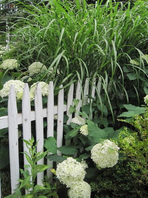I wanted a low-maintenance planting that would provide a beautiful view from the two areas where we entertain the most: the screened porch and the fenced garden. A hedge of Hydrangea arborescens ‘Annabelle’, underplanted with two varieties of green and white hostas was a perfect solution for this east-facing side of the house.