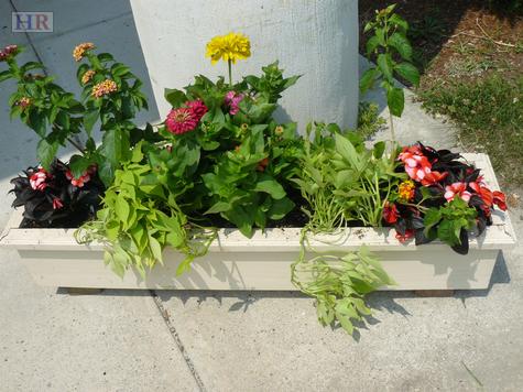 Our most recent planting was designed with the help of the staff at Medway Garden Center. The flowers include geraniums, light green and purple ipomoea potato plants , lantana and New Guinea impatiens. Students are responsible for watering the plants by hand and maintaining blooms throughout the year.