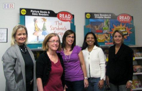 Doing the heavy lifting for the Fair opening: Doris Berard, school staff; Ellen Ahern, Elementary School Librarian; Gena Rider, Neela Patel, HPTSA volunteers; Meg Murphy, Scholastic Books.