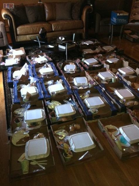 In addition, each tray included a handmade card from children of the Newcomers Club wishing the recipient a happy and healthy holiday season. Busy volunteers created an assembly line to fill each styrofoam container with cooked food while another group placed the containers in cardboard trays.
