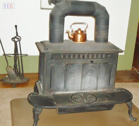 (1840 American heating stove with British Officer's tea pot from the pre-revolutionary era.)