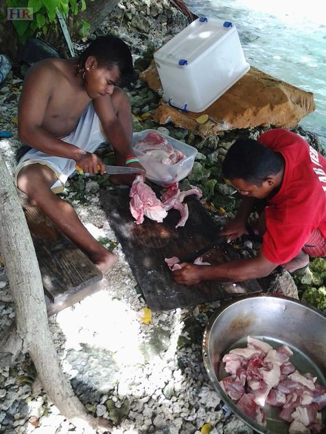 Boo has learned to eat anything and everything without hesitation, because she’s afraid if she does she won’t be able to eat it. She eats lots of fish and rice. The Marshallese eat just about everything but the bones. Delicacies are when a pig or chicken is slaughtered for a special event, or when someone comes from Majuro bringing western food. When Boo’s Mom visited they bought three cases of chicken and two cases of hot dogs. Picture them carrying that on the small boat slamming through the waves on its way to Bikarej. Food can get low as the Island waits to be resupplied. On the outer islands one never knows when the next boat will arrive.