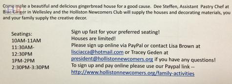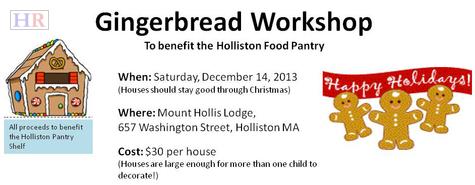 Dee Steffen the Assistant Pastry Chef from Blue Ginger (http://www.ming.com/blue-ginger.htm) is making and donating 75 gingerbread houses for us to sell for people to decorate with their families on December 14th, all proceeds are going to the Holliston Pantry Shelf this year. The Newcomers are providing the candy and frosting for the decorating. We would love to get something into events to advertise it, since we still have about 30 houses available on that day.