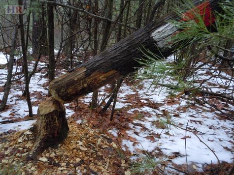 Beavers have downed an Alder tree. This tree is about 12 inches in diameter. The red and white mark on the tree indicates that this is a US Army Corp area for flood control.