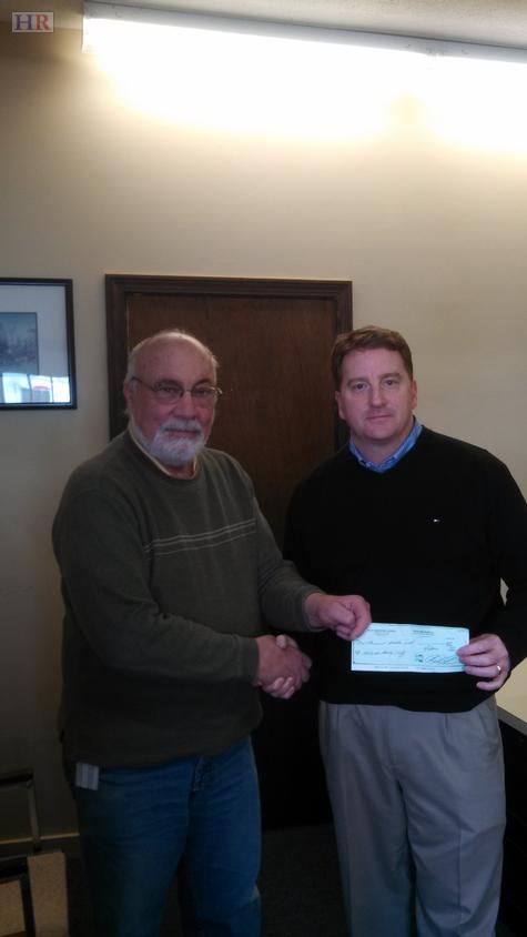 Carl Damigella accepts a check for $1000 for the Holliston Pantry Shelf from Chris O'Neil of Kiley Insurance in Holliston.