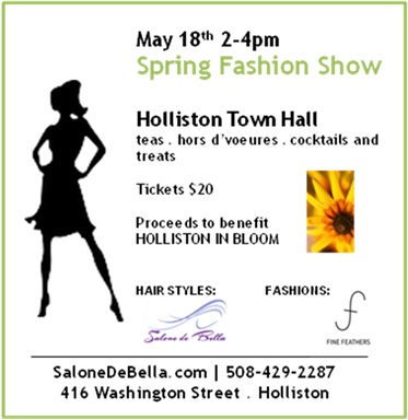 Salone de Bella is pleased to announce that it is sponsoring a fashion show on May 18th from 2-4 p.m. at Holliston’s Upper Town Hall to benefit Holliston in Bloom. Tickets will be sold in advance for $20 and can be purchased at Salone de Bella, Fiske’s, Depot Package Store and the Holliston Superette.