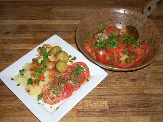 I decided to make a meal, rather than just a dish to fully experience a typical dinner. I made a traditional Algerian tomato & cilantro salad and a chicken and vegetable couscous (leave out the chicken and you have a great vegetarian dish). A number of my friends have asked me to post the recipes (thanks for the suggestion, Lulu and Gail), so they're included here. And my old (not literally) friend Jimmy encouraged me to journal about this experience - thank you. I think food and eating is best when it's a total sensory experience: smell, taste, texture and color. These dishes hit all of those elements and then some.