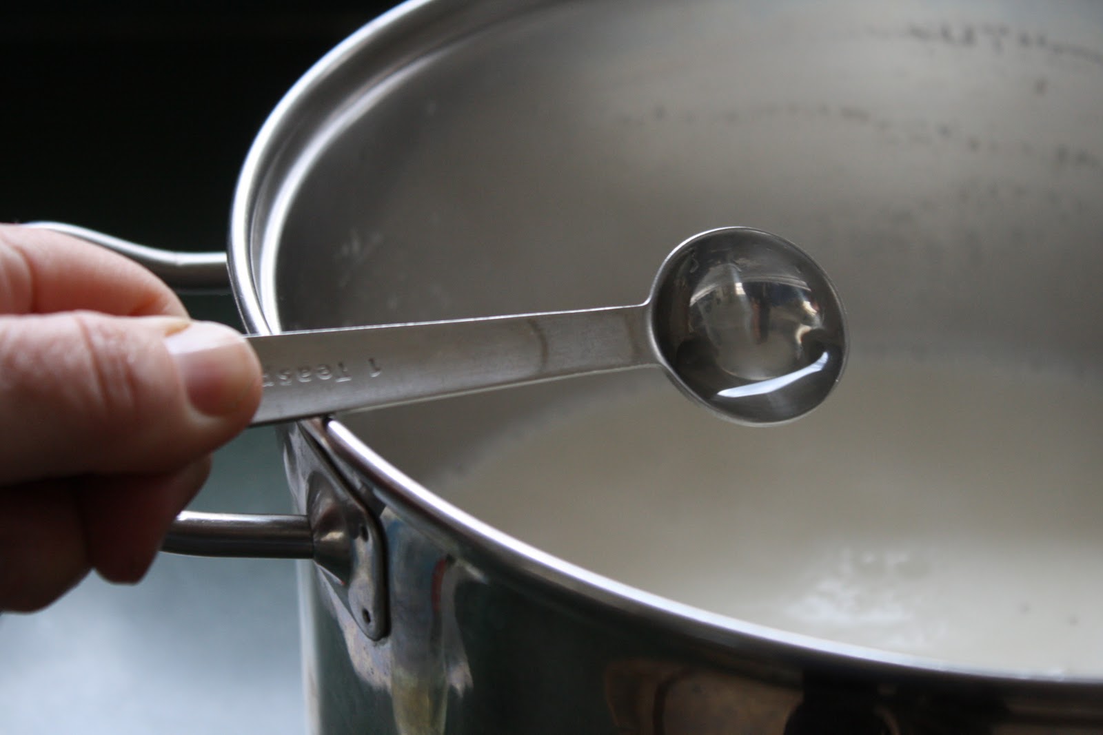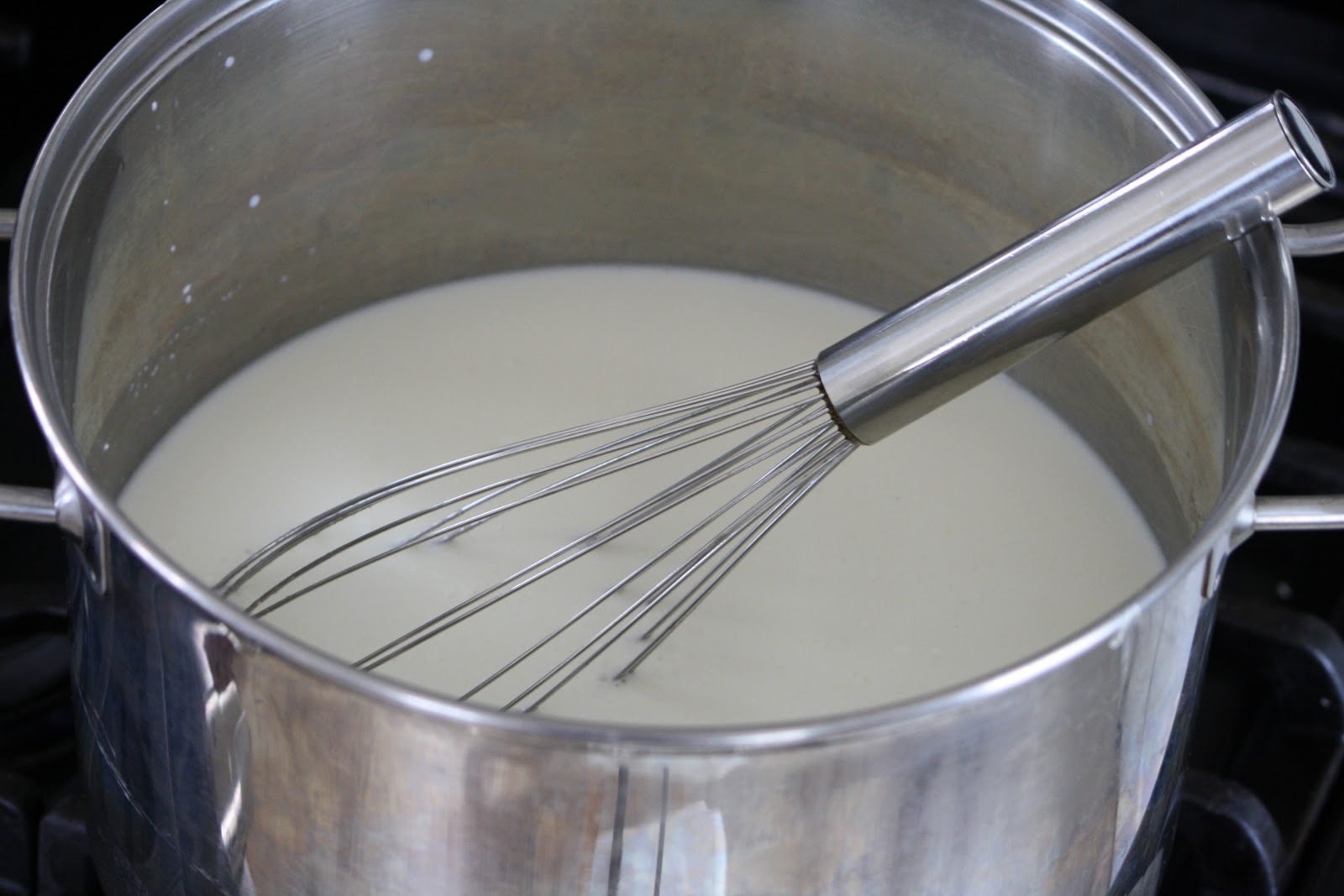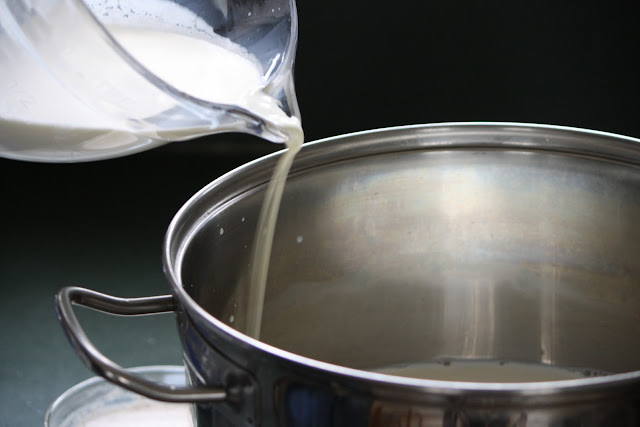 Add nine cups of whole milk to a large pot
