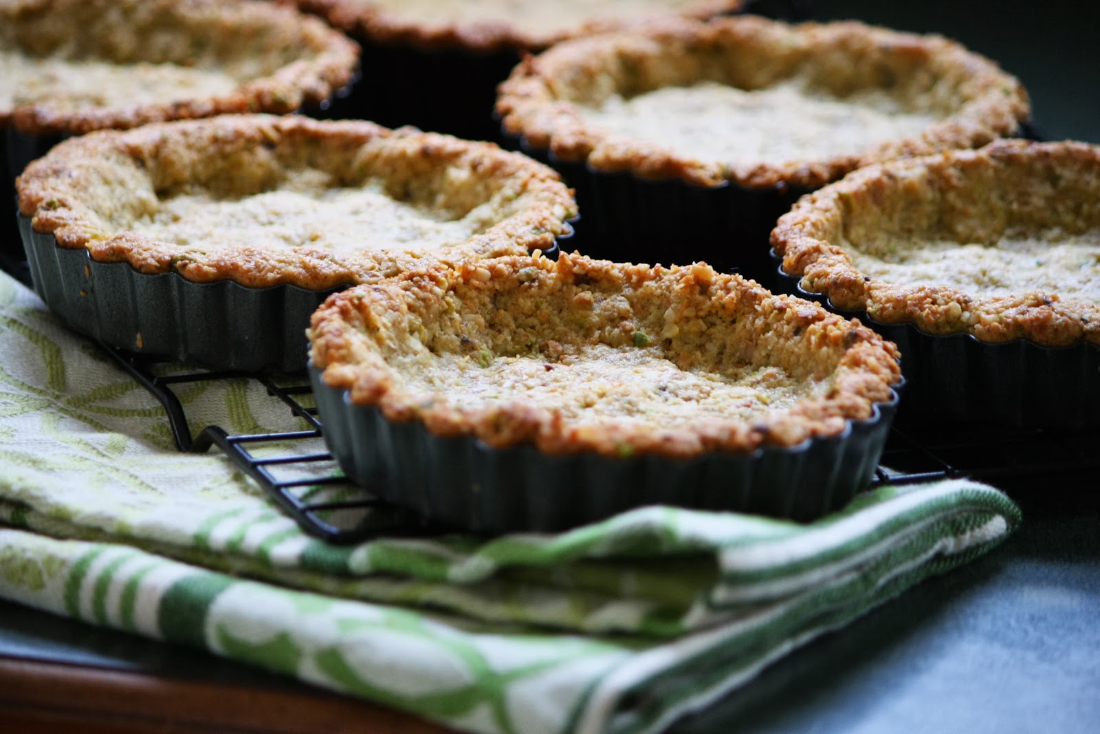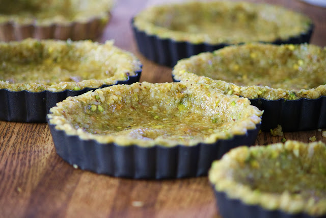 Meanwhile grease about 8 x 10cm tartlet pans (the ones with removable bottoms) and when ready use plastic wrap to press about 1/3 cup of the nut mixture onto the bottoms and up the sides of your prepared tartlet pans.