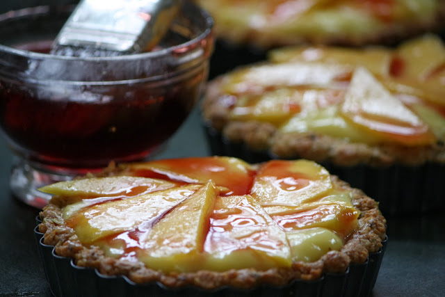Spoon curd into tartlets, arrange mangoes on top, then brush with warm red currant jelly