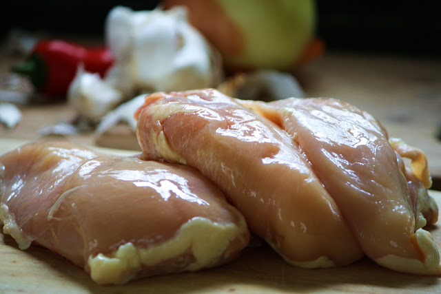 Saute onions, garlic and chili pepper in olive oil, then add chicken, tomatoes and peanut butter