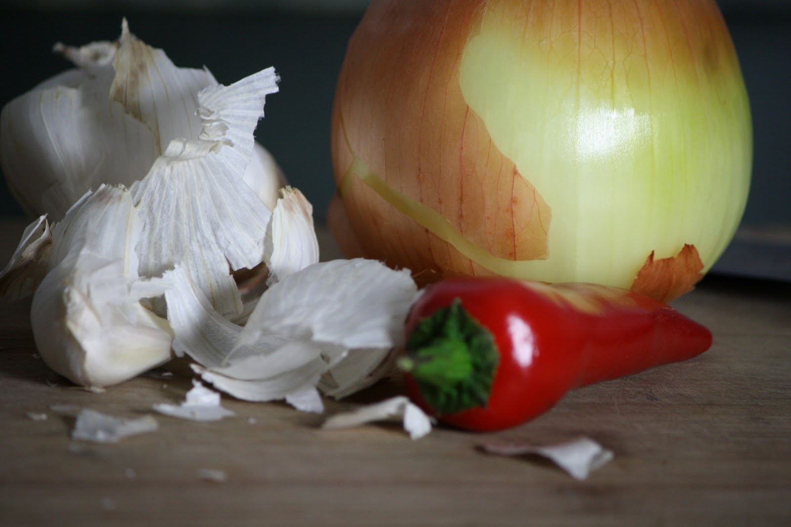 3. Meanwhile heat oil in frying pan. Saute onions and garlic about six minutes, until translucent.