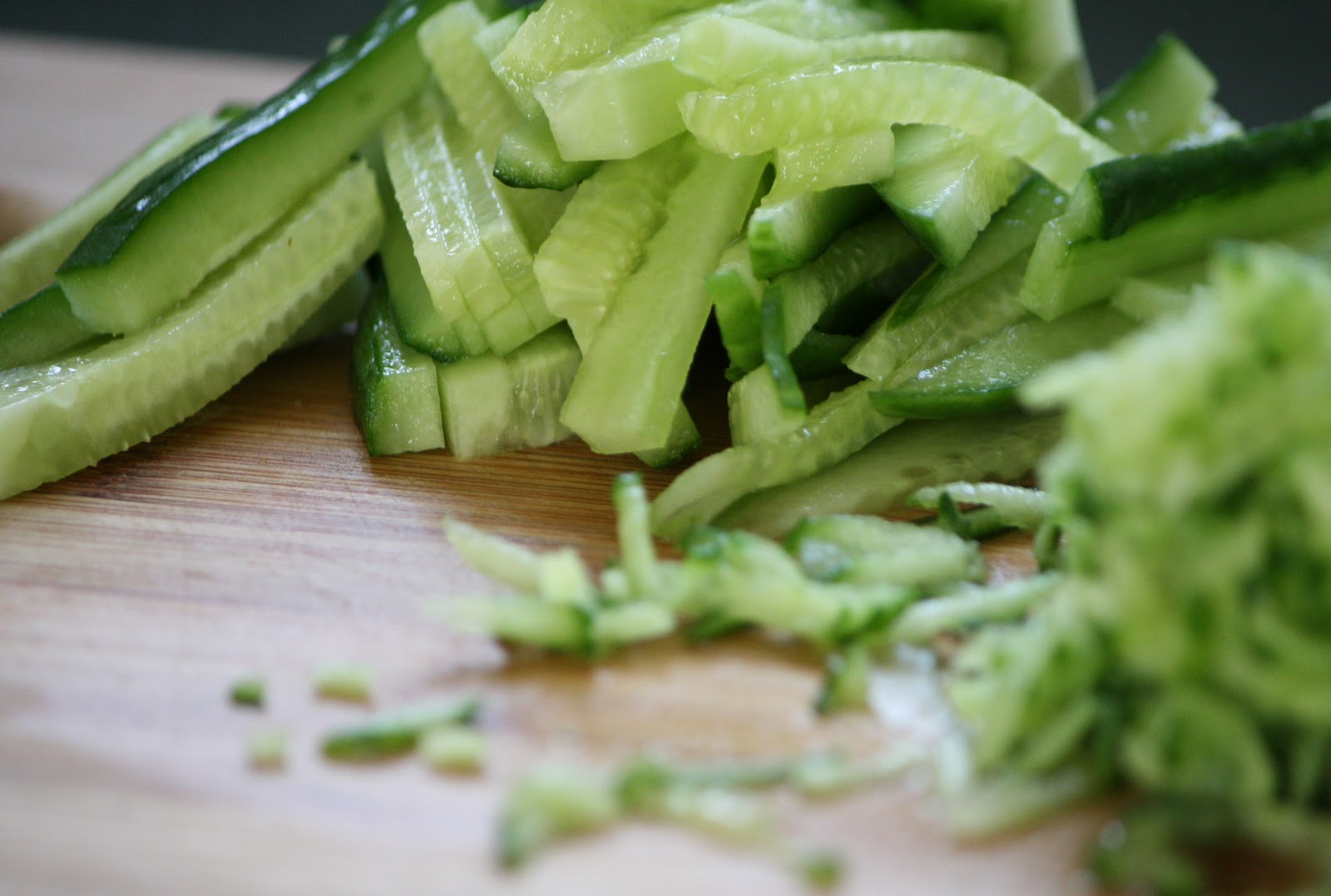 - Julienne ¾ of cucumber into relatively small pieces. Cucumber seed and skin can be removed if you choose. We leave about a ¼ of skin to add color to chutney. Grate remainder of cucumber and add to mixture, which adds moisture to chutney.