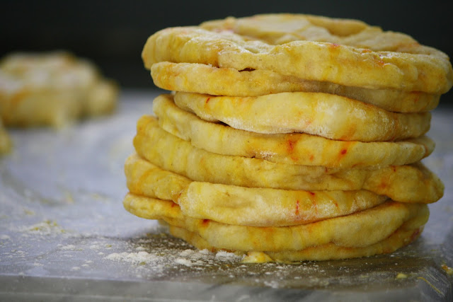 - Take a ball of the barra dough and pat into a flattened 4-inch circle with both hands. If the dough sticks to your hands dampen hands with water. Fry immediately after shaping in hot oil, turning once. Drain on paper towels and allow to cool to room temperature.