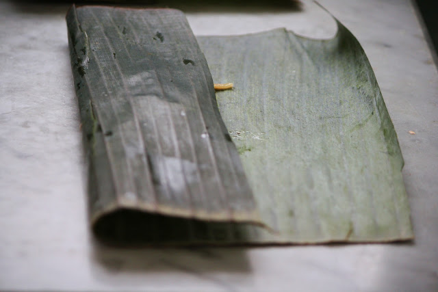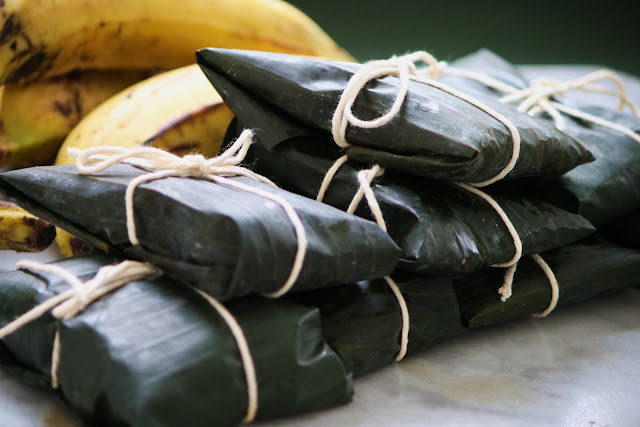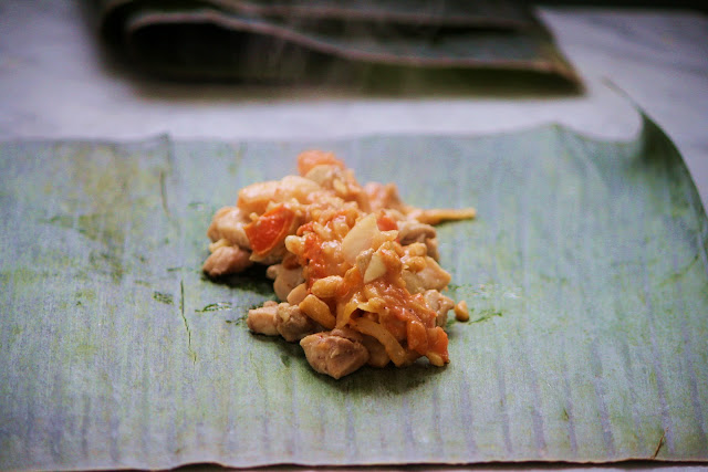 3.Plunge the banana leaves in boiling water to soften them remove the mid-rib* and cut the ends off the leaves to form rectangles. Place a portion of meat and some of the tomato-onion sauce (and mushrooms and smoked meat or fish, if desired) in the centre of a leaf. If you buy packed banana leaves, most brands (like Goya) have already removed the mid rib for you*