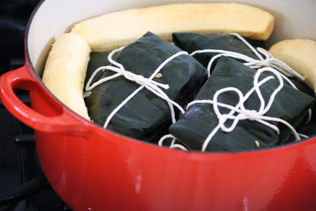 5.Place a wire rack or trivet in the bottom of a large casserole dish then add water to the bottom of the trivet. Place the meat packages on top of the trivet and cover the dish. Bring to a boil and steam the packets for at least an hour. Add the plantains to the pot as well.